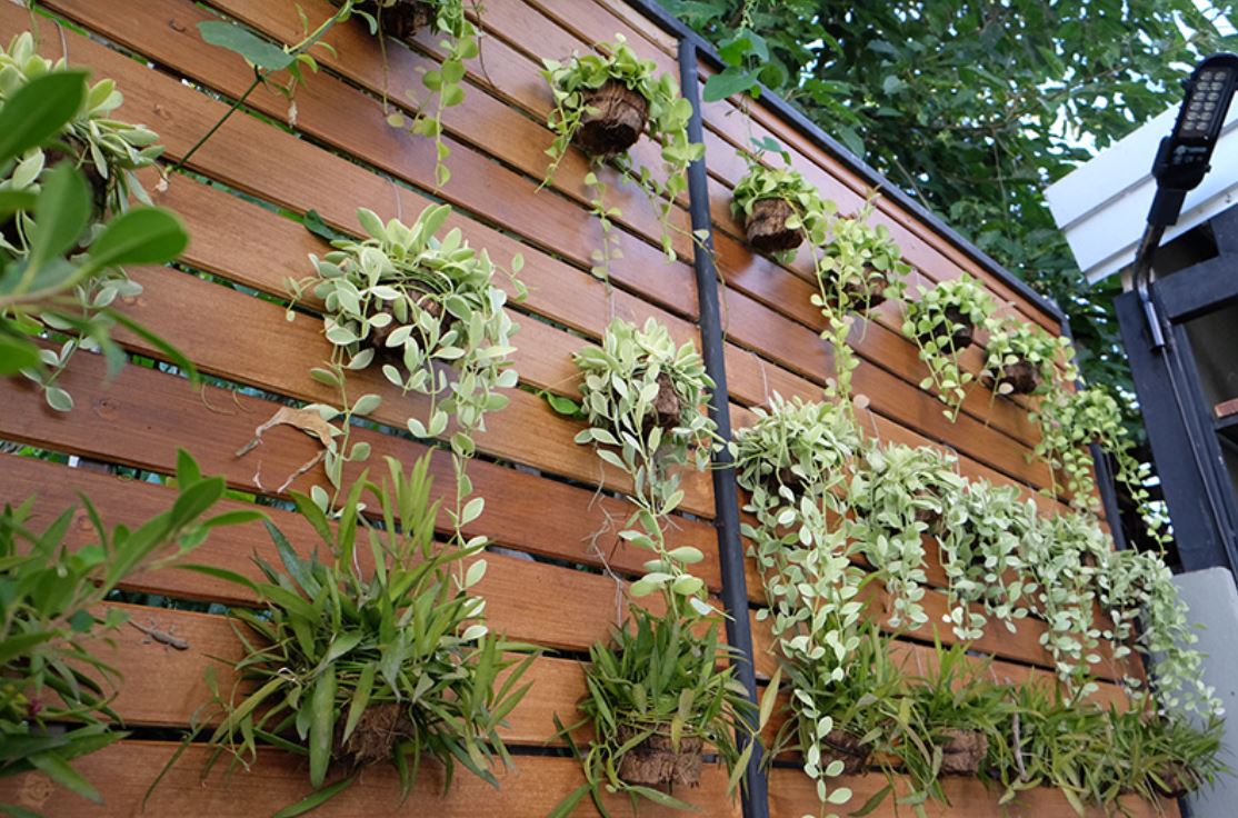 Hang an over-the-door shoe holder on the fence and fill the sections with herbs for repurposing. This unique vertical planter adds a splash of greenery to any outdoor space.